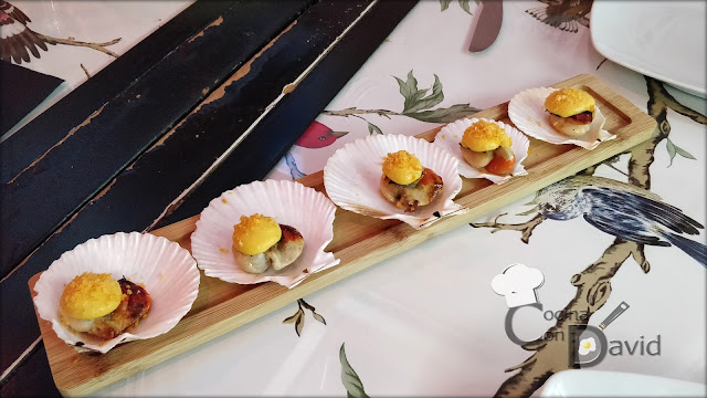 Comenzamos con las zamburiñas, cocinadas a la plancha y presentadas sobre una concha limpia, sobre ellas una crema suave de maiz, kimchi y unas migas de pimentón. La mezcla está muy buena.