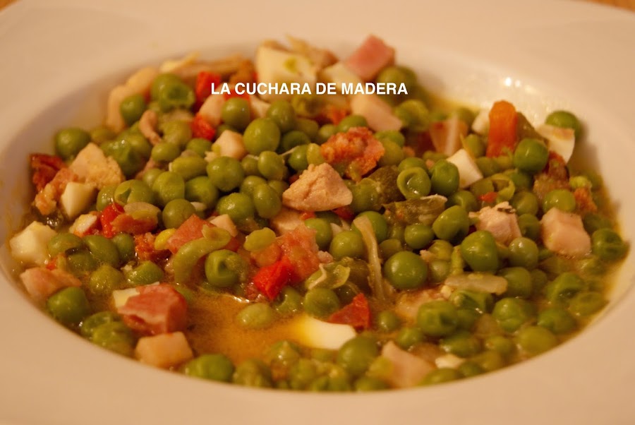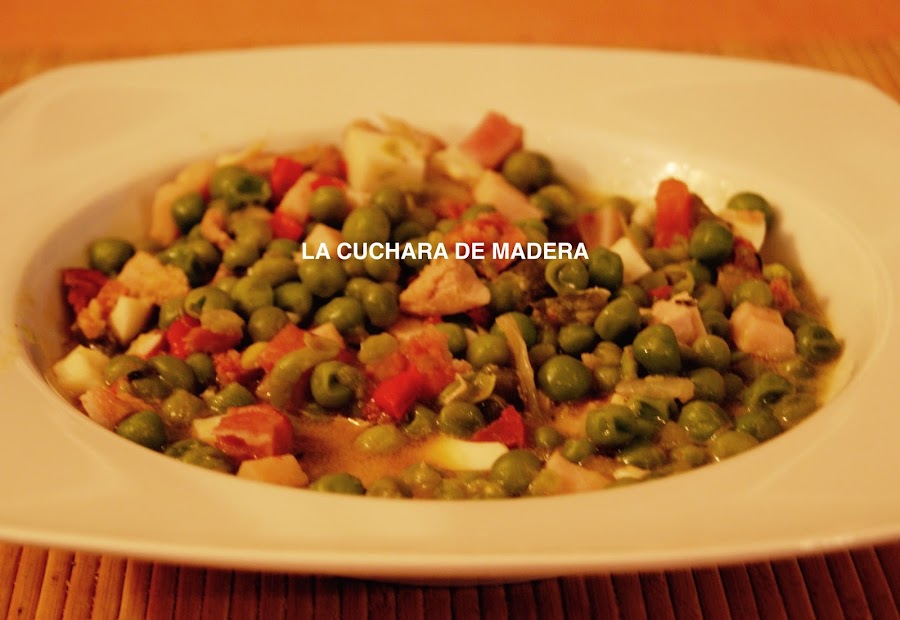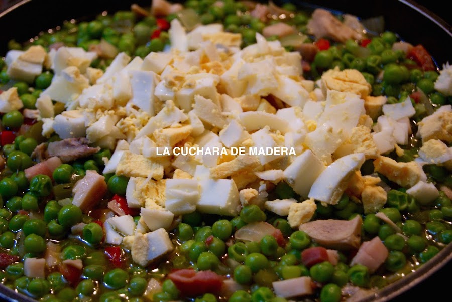Ahora pondremos las cucharas del tomate natural triturado junto con el vino blanco y los guisantes ó arvejas, removemos.