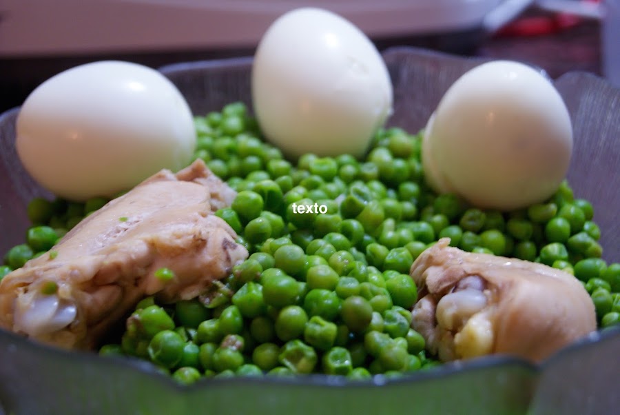 Mientras, en un caldero ponemos agua y apenas un poco de sal; cuando empiece a hervir el agua añadimos los guisantes y los dejamos unos 5 minutos. Los vamos a sacar antes de que se terminen de hacer ya que los terminaremos con la fritura y especies. En otro caldero hacemos los huevos duros.Por otro lado,en una olla rápida cocinamos el pollo con agua y sal hasta que estén tiernos, unos 10 minutos más o menos dependiendo de la olla.Reservamos el caldo del pollo si no tenemos caldo de verduras y carne.
