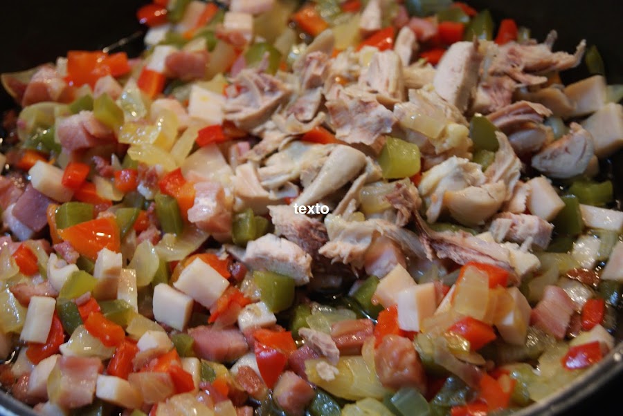 Picamos la pechuga de pavo y el jamón serramos en dados pequeños y los añadimos a la fritura,removemos y dejamos a fuego medio/bajo.