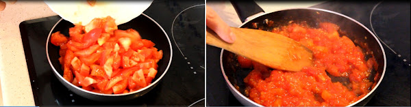Mientras se asan los pimiento vamos preparando el tomate. Los pelamos y los picamos en trozos medianos. Los ponemos en una sartén, sin aceite, y los vamos haciendo a fuego medio , dándoles vueltas , para que no se peguen hasta que hayan perdido el caldo. Los dejamos enfriar.