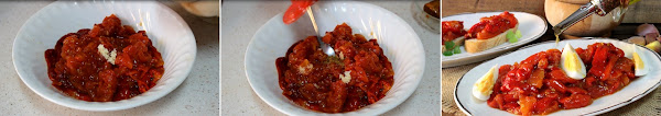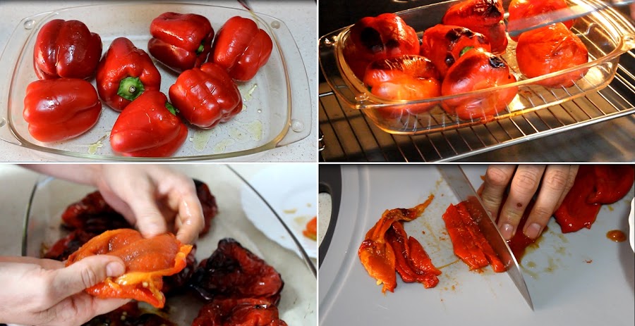 Existen muchas variantes de esta ensalada, así como la forma de prepararla, generalmente se asan los tomates y los pimientos juntos, pero mi madre la hace a su manera, y así es como lo ha aprendido yo...