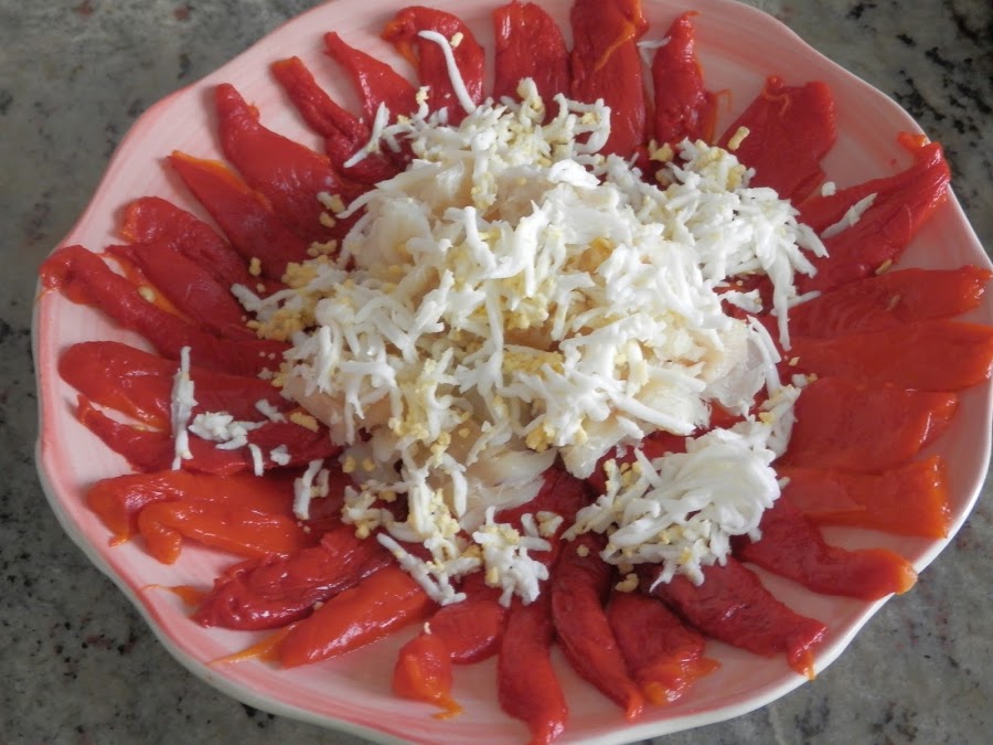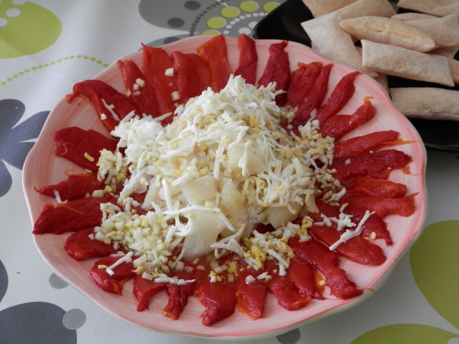 ¿Cómo va la semana? La mía al fin termina, ha sido un poco "intensa"jejeje, pero bueno, no hay mal que cien años dure ni cuerpo que lo resista, ¿verdad? Hoy os traigo un ¿entrante, ensalada, primero? No sé cómo denominarlo, lo que sé es que en casa es un plato muy recurrido y lo utilizamos tanto de picoteo como de principal, ya sabéis que a señoresposo, le encanta el bacalao, así que es un básico en casa.