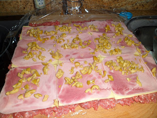 Lo siguiente que haremos es cubrir con el queso toda la carne, lo mismo que haremos con el jamón cocido y por último con las aceitunas.