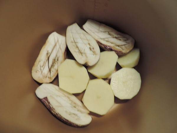 Cortamos las berenjenas por la mitad y les hacemos unos cortes en el centro, las patatas también en trozos grandes, y las ponemos en la cubeta de la olla.