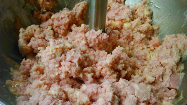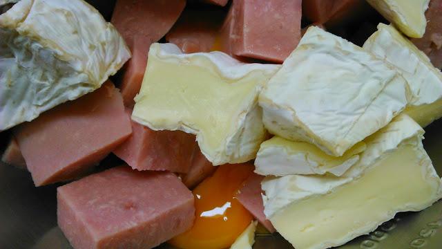 Relleno: Trituramos el jamón york con el camembert y el huevo.