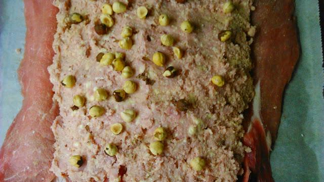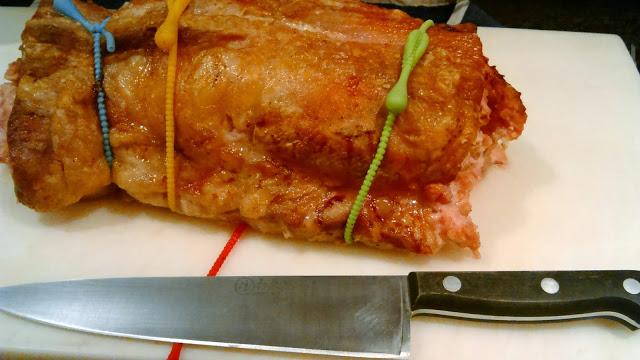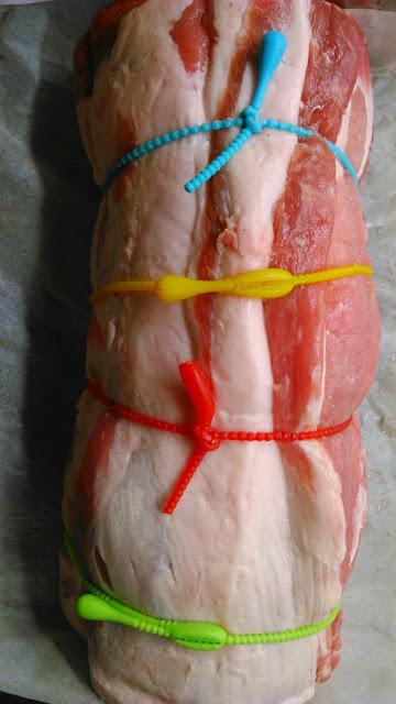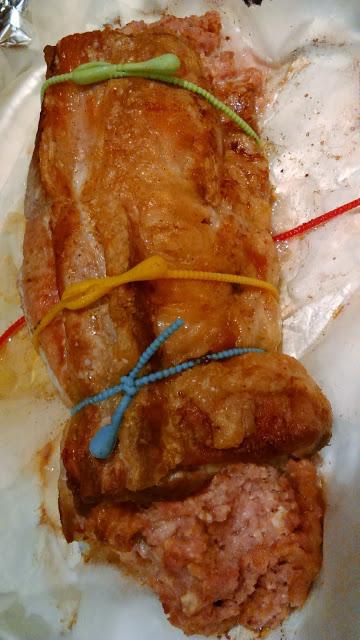 Atamos la carne. Para mí lo ideal es la malla, pero en esta ocasión no encontré y utilicé los atadores de silicona. Lo malo es que se sale un poco el relleno por los laterales, (que aproveché para hacer una salsa) pero queda más rústico.