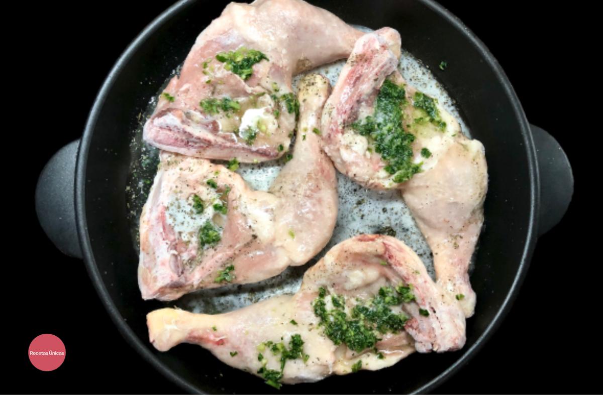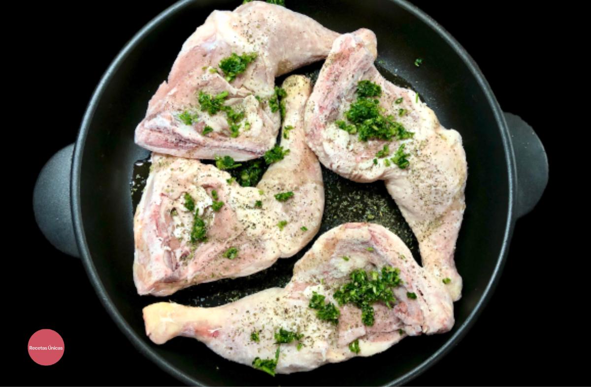Poner en una olla antiadherente los cuartos de pollo directamente del congelador por la parte de la piel.