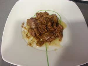 Paso 3. Añadimos la asadura, el pimentón, el colorante y el medio vaso de vino (también se puede hacer con vino blanco) programamos menú guiso durante 45 minutos a temperatura 2 (110ºC). Ir moviendo de vez en cuando.