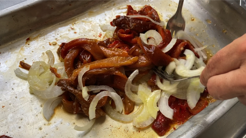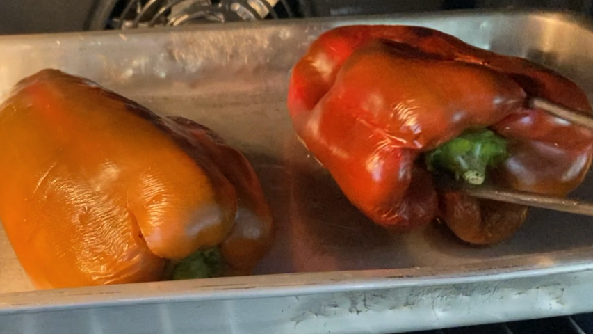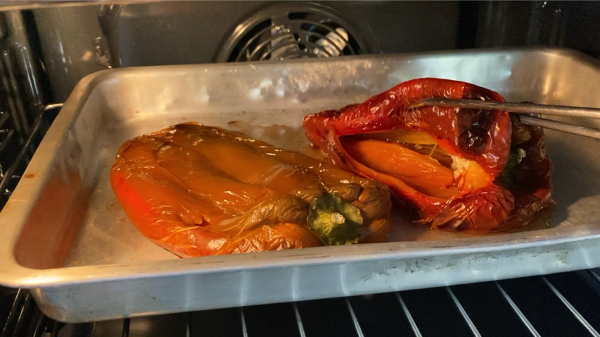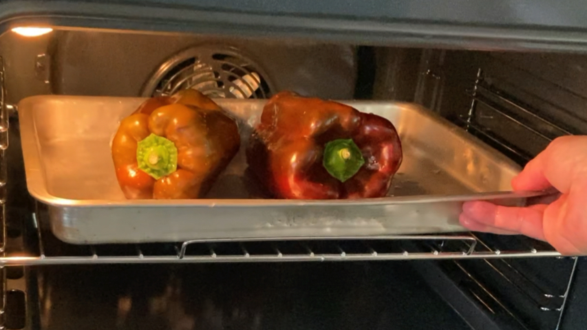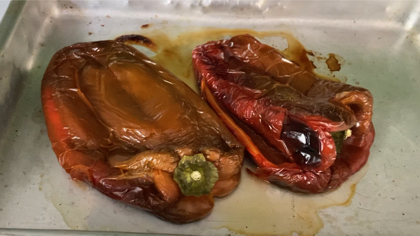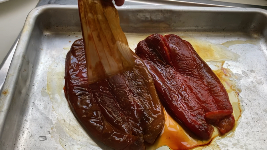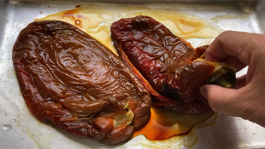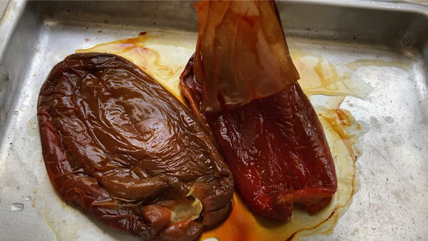 En vez de a las brasas el pimiento (y el tomate) se puede asar en el horno de casa a 180º C (356º F) durante 1 hora y cuarto. Después se deja enfriar tapado y se procede igual que con el asado a leña.