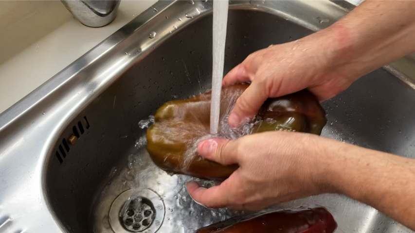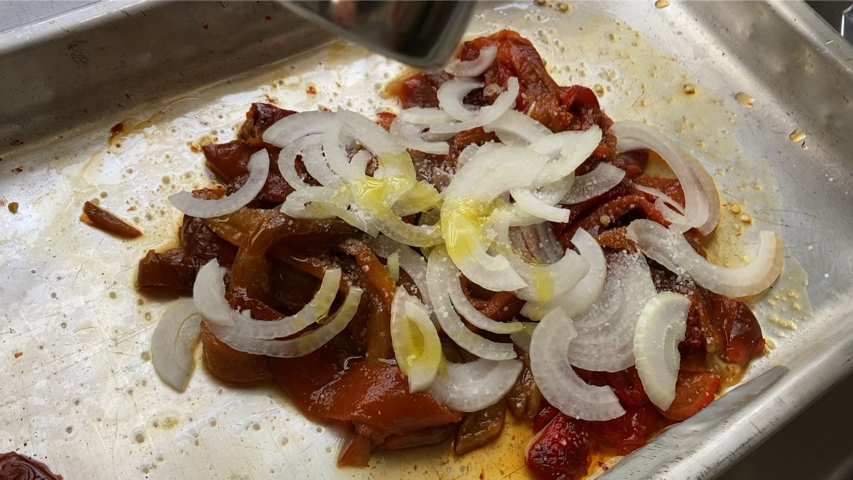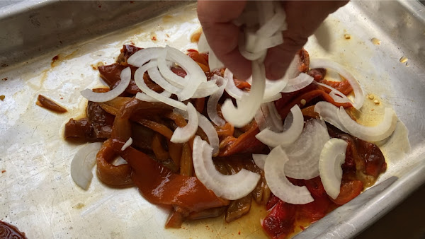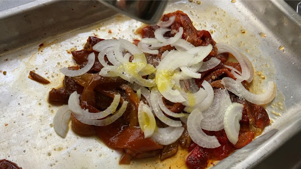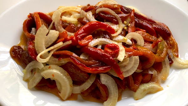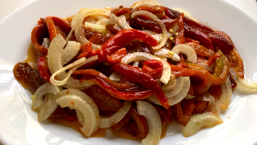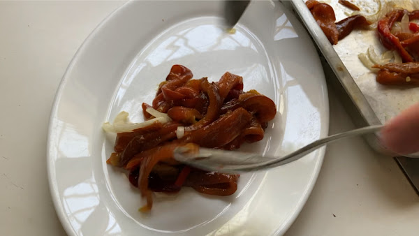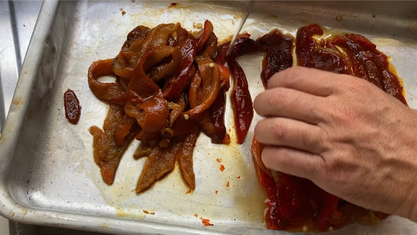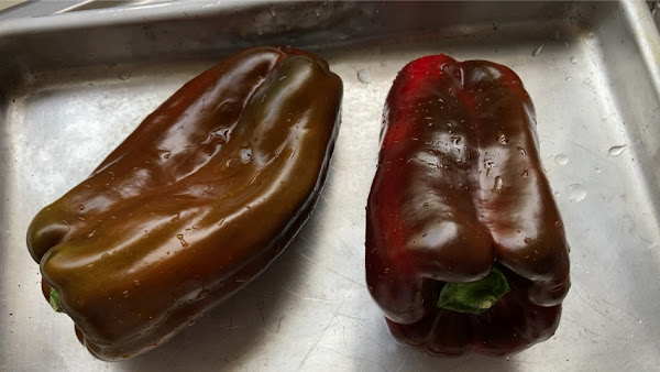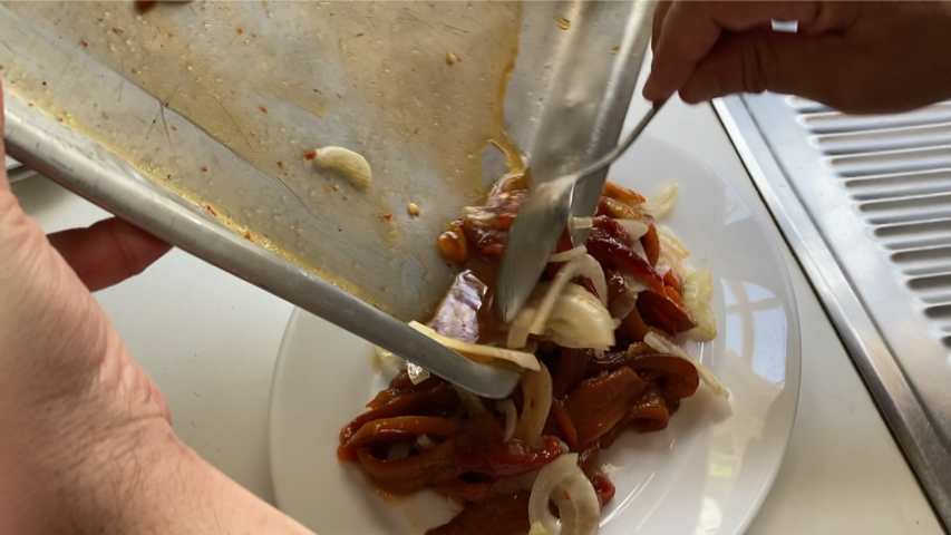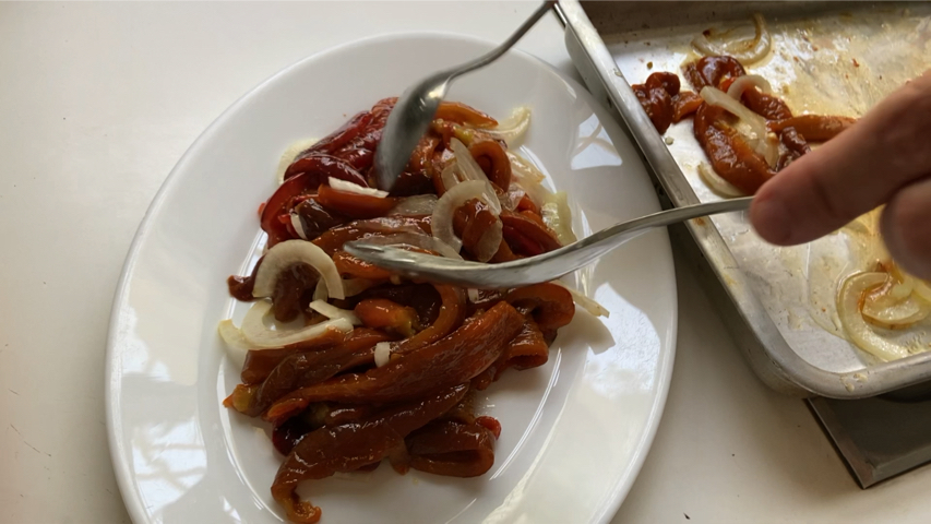 En vez de a las brasas el pimiento (y el tomate) se puede asar en el horno de casa a 180º C (356º F) durante 1 hora y cuarto. Después se deja enfriar tapado y se procede igual que con el asado a leña.