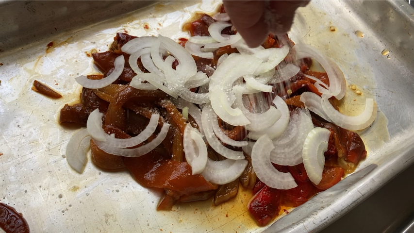 Pon la cebolla con el pimiento soltando las distintas capas.
