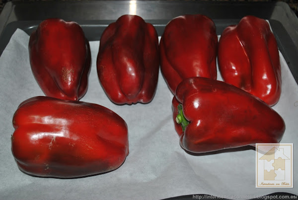 Tendremos el horno precalentado a 200º calor arriba y abajo e introduciremos la bandeja en el mismo hasta que los pimientos decaigan.