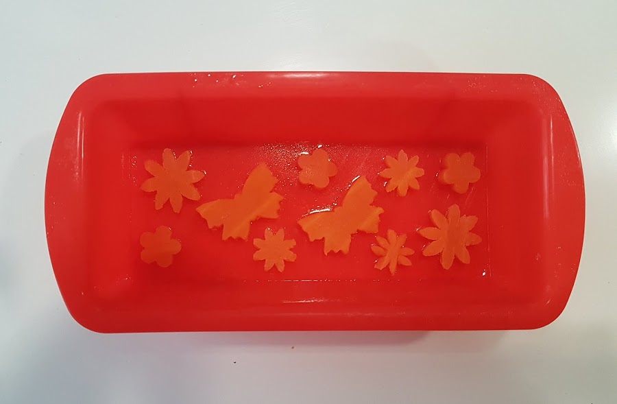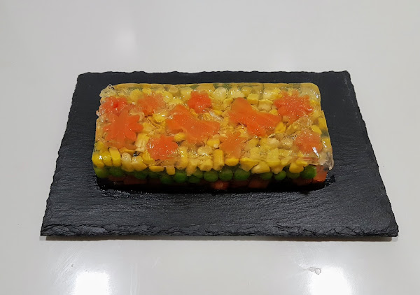 Este aspic consta de 4 capas, la primera está hecha con la zanahoria cortada en tiras. He utilizado cortadores de fondant para que tenga forma de flores y mariposas. La segunda capa es de maiz, luego otra de guisantes y por último la zanahoria cortada en cubos.