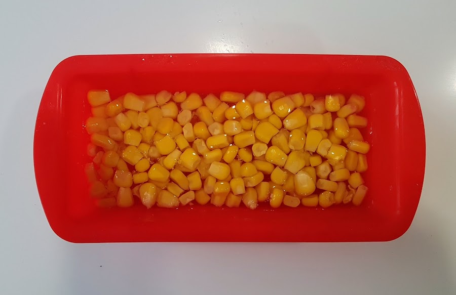 Sacamos el molde y colocamos las zanahoria que hemos cortado de manera un poco artística Cubrimos con un poco de gelatina y volvemos a introducir el molde otros 3 minutos. Sacamos el molde y cubrimos el maiz. Hay que tener en cuenta que vamos a poner 3 capas así que cada capa no debería de ocupar mas de un tercio de la altura del molde. Cubrimos con la gelatina y volvemos a introducir el molde en el congelador 3 minutos.