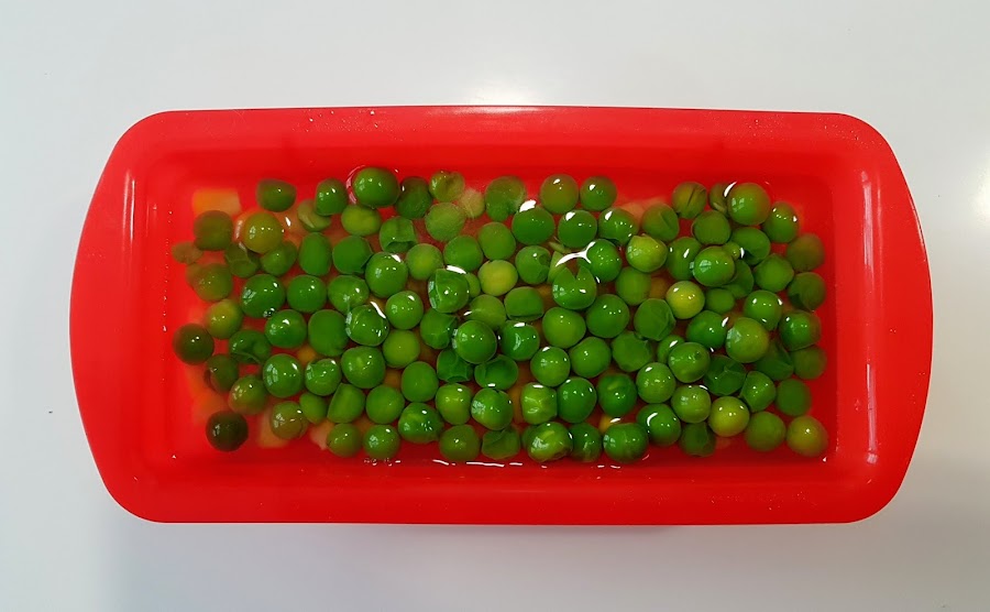 En primer lugar hervimos los guisantes y la zanahoria cortada en cubos. Para las tiras de la capa de arriba yo he preferido cortar las tiras en crudo y hervirlas después. En vez de hervirlas se pueden hacer al microondas, en un molde de silicona con un poco de agua. La zanahoria se hace en unos 4 minutos y los guisantes en unos 10.
