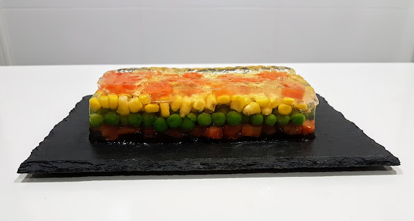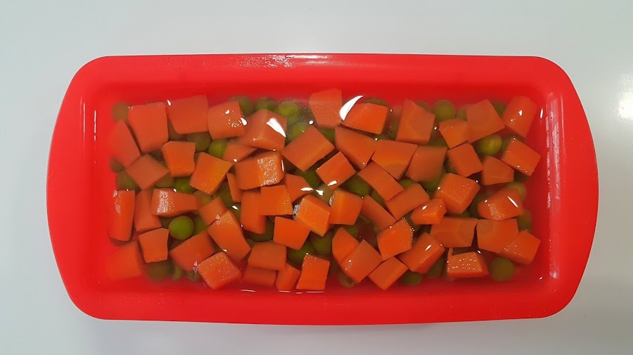 A continuación añadimos una capa de guisantes y cubrimos con más gelatina. Y...si, volvemos a introducir el molde 3 minutos al congelador. Lo sacamos, añadimos la capa de zanahoria y cubrimos con la gelatina que quede. Ahora lo introducimos en el frigorífico y lo dejamos enfriar un mínimo de 4 horas.