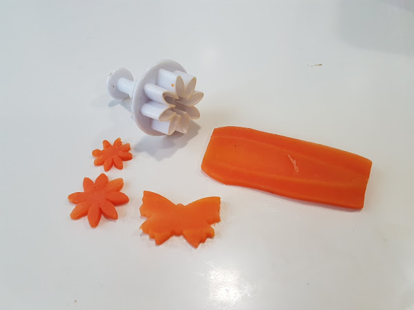 Mientras tanto, cortamos la zanahoria en tiras con alguna forma bonita. Yo he utilizado unos cortadores de fondant con forma de flores y mariposas.
