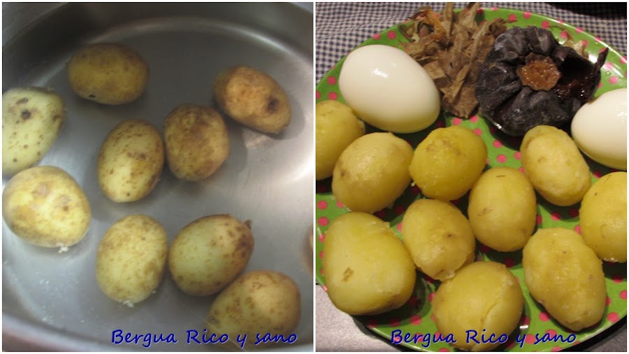 2. Lavamos bien las patatas, en mi caso varias pequeñas porque son las que están en temporada aquí. Cocemos con piel en agua hirviendo dejándolas al dente, es decir que no las cocemos del todo. El tiempo dependerá del tamaño, de si usas olla normal o a presión... Dejamos enfriar un poco y las pelamos.
