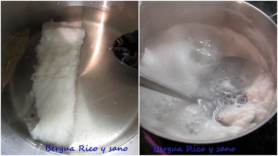 3. Ahora vamos a hervir el bacalao en agua con la hoja de laurel, las patatas peladas y la ñora durante unos 10-15 minutos, hasta que esté bien tierno. A medida que cuece, vamos retirando la espuma. Una vez cocido, desechamos la piel y comprobamos que no hayan espinas.