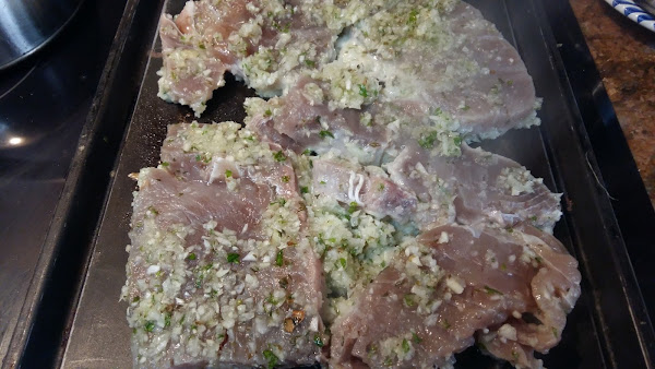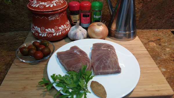 2 rodajas de atún de 180 gr cada una,1 cebolla,2 dientes de ajo,8 tomates cherry, 2 cucharadas de aceite de oliva, 1 hoja de laurel, perejil fresco, clavos de especia, orégano, pimienta negra molida y sal.