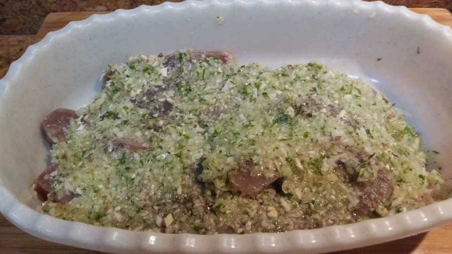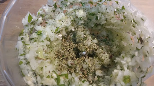Empezamos haciendo el macerado. Picamos la cebolla, el perejil y los ajos en la picadora y le añadimos el laurel desmenuzado, 2 o 3 clavos, pimienta molida, orégano y sal. Las especias son un poco a tu gusto.