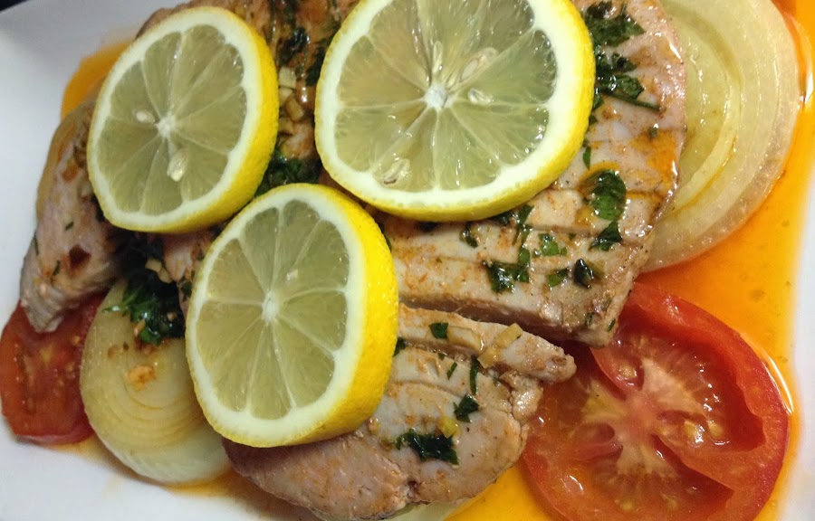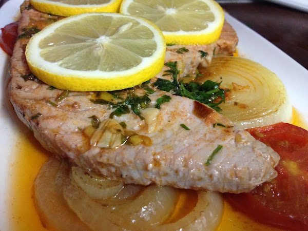 3.- En la misma sartén o plancha, asamos el atún 4 o 5 minutos hasta que este dorado por fuera, sin que se reseque por dentro. En el proceso le damos la vuelta con mucho cuidado. Una vez hecho lo colocamos sobre las cebollas y los tomates, cortamos unas rodajas de limón y decoramos el atún. Servimos inmediatemente.