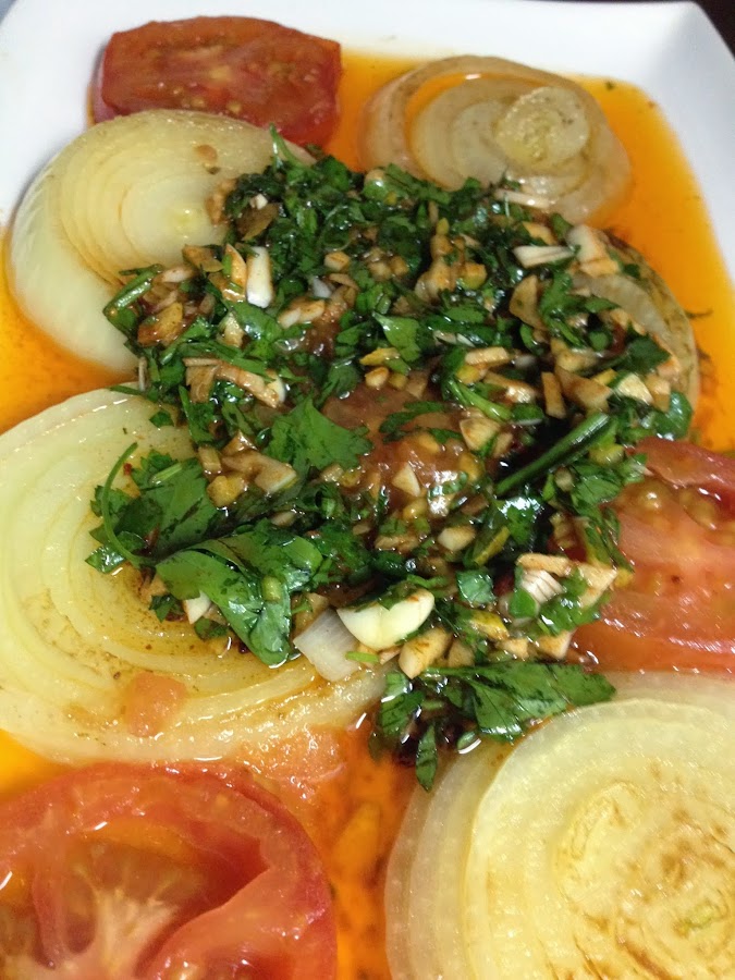 2.- Calentamos bien el sartén o una plancha, ponemos las cebollas cortadas en rodajas y los tomates. Los rociamos con un poco de aceite y asamos 5 minutos por cada lado. Hasta que empiecen a tomar color. Los colocamos en un plato o bandeja de servir y lo rociamos con la marinada que ha sobrado.