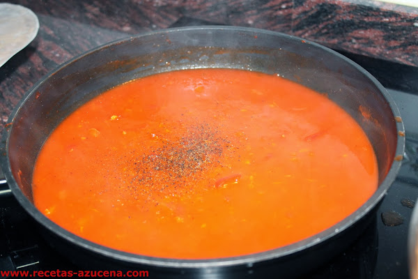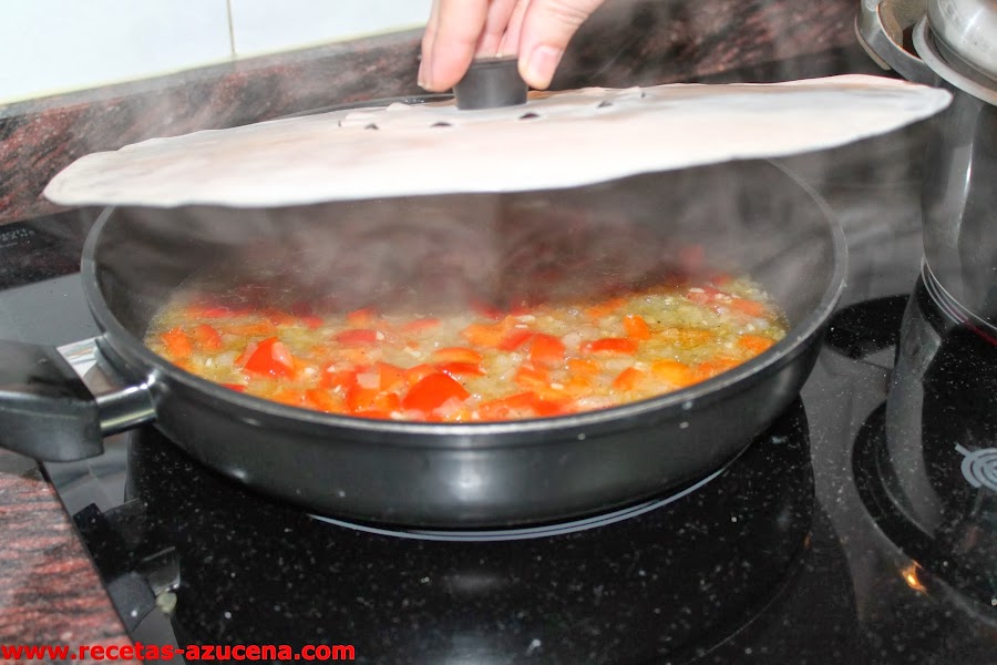 Pasados los dos minutos añadiremos el agua y rectificaremos el punto de sal y de pimienta, tapamos la sartén y dejaremos hasta que rompa a hervir el agua.