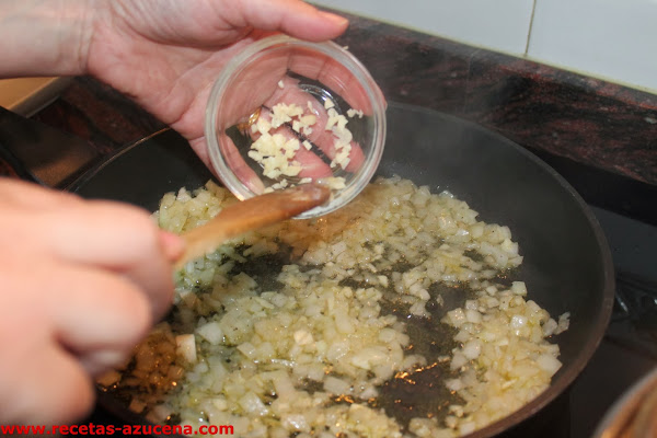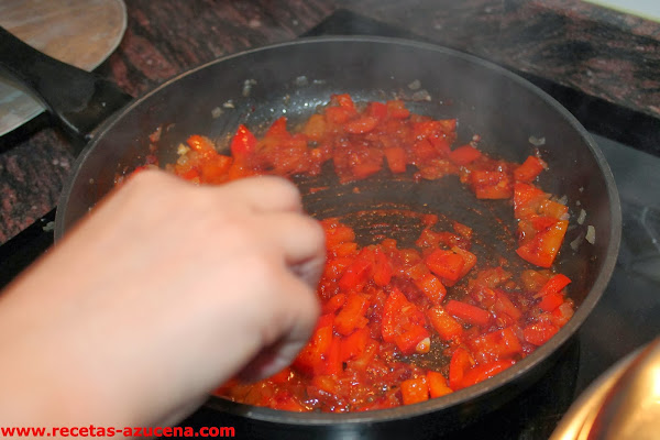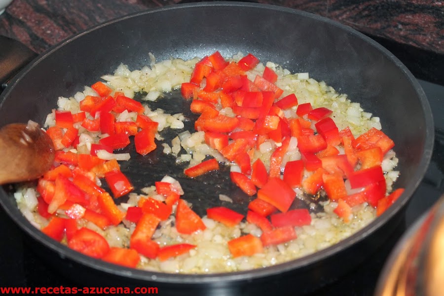 Pasados los dos minutos añadiremos los ajos picados y dejaremos sofreír 1 minuto más, para añadir el pimiento, removemos todo y lo dejamos sofreír 4 minutos.
