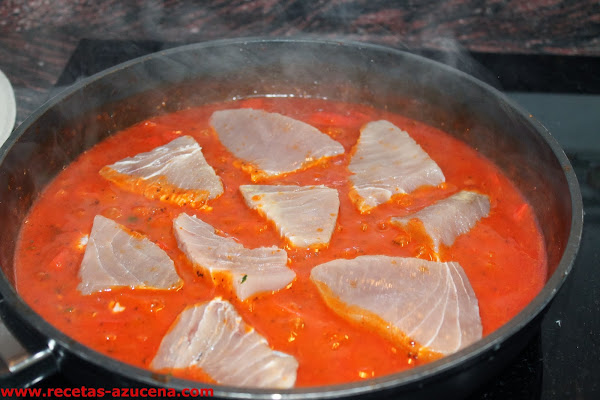 Cuando el agua haya reducido un poco añadiremos los tacos de atún, taparemos la sartén y dejaremos que se haga 2 minutos para poder darle la vuelta y dejarlos otros 2 minutos, para poder sacarlo, este tiempo depende del grosor que tenga el atún, lo que buscamos es que no se haga mucho.