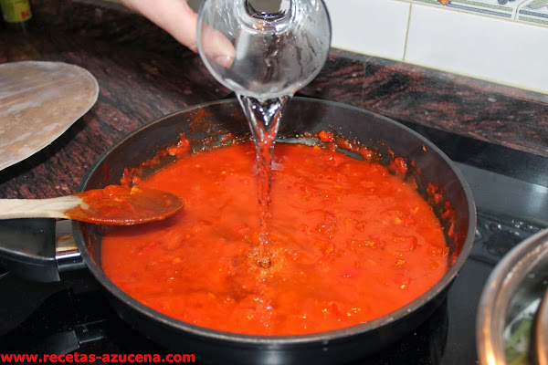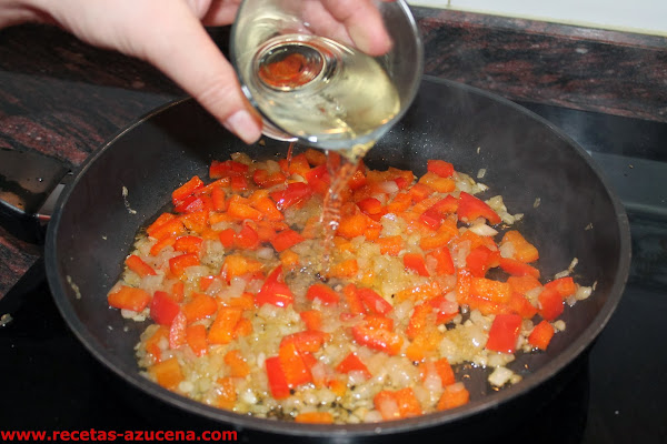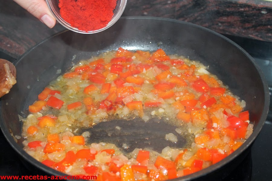 Cuando el vino haya reducido un poco más de la mitad añadiremos el pimentón, lo removemos todo y lo dejamos sofreír unos 15 segundos sin parar de remover.