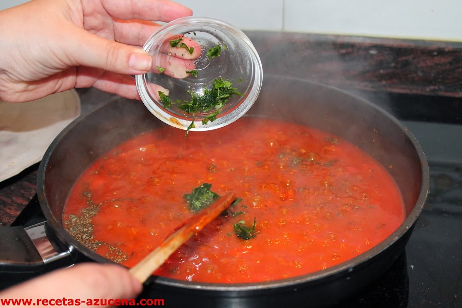 Cuando ya esté caliente el agua añadiremos la albahaca seca y el perejil, removemos y dejamos que reduzca un poco.