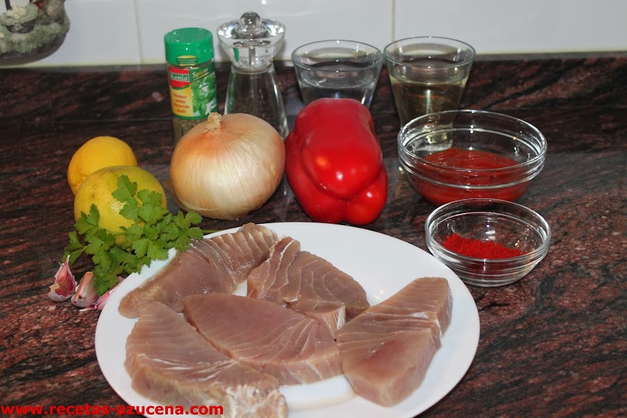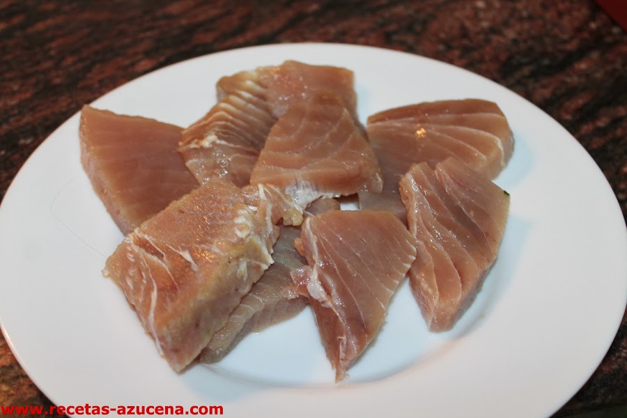 Los filetes de atún los cortaremos en trozos grandes de unos 3 centímetros.