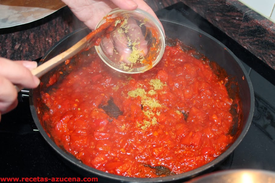 Ya podemos añadir el tomate frito removemos, y añadimos la ralladura de limón, volvemos a remover y ahora añadiremos el jugo de limón poco a poco e iremos probando hasta que nos salga un puntito de acidez al probar, dejaremos sofreír 2 minutos.