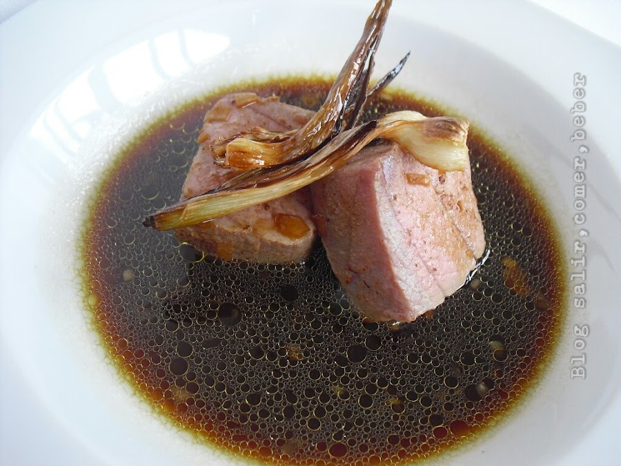 Para acabar, ponemos los tacos de atún en un plato hondo y salseamos con nuestra sopa miso hirviendo, este calor será suficiente para dejar el atún en su punto, los que seáis reacios a tomar el pescado muy poco hecho, atreveos que os sorprenderéis. Finalmente ponemos los ajetes encima del atún y a disfrutar!