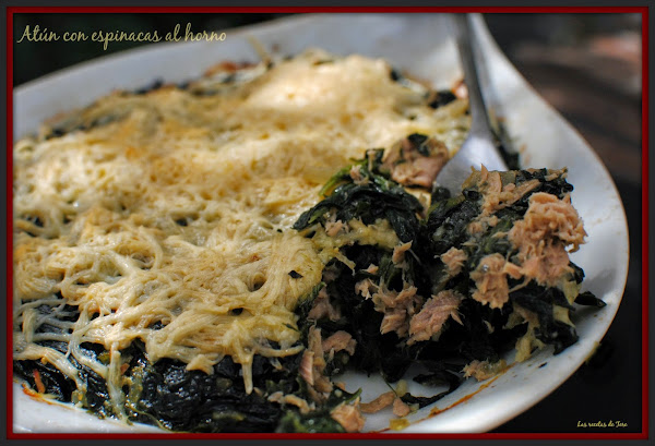 Ahora sobre la cama de atún que tienes preparada en el molde refractario echas las espinacas que tenias rehogando con la cebolla y el ajo, haciendo otra cama pero esta vez de espinacas.