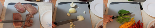 Cortamos la cebolla en juliana. Cortamos los ajo en láminas. Cortamos los pimientos en tiras.