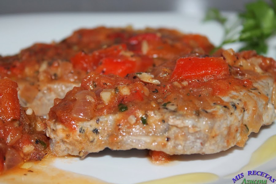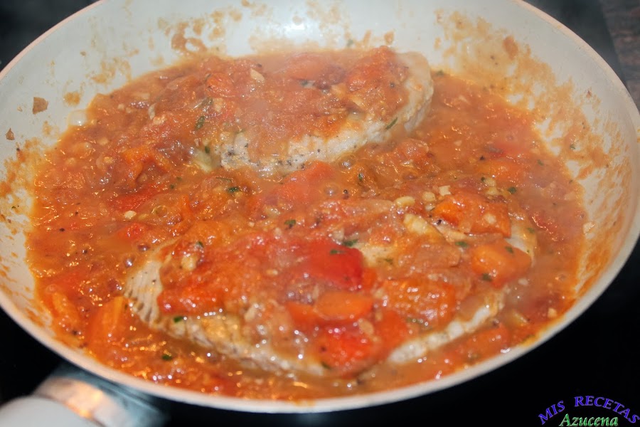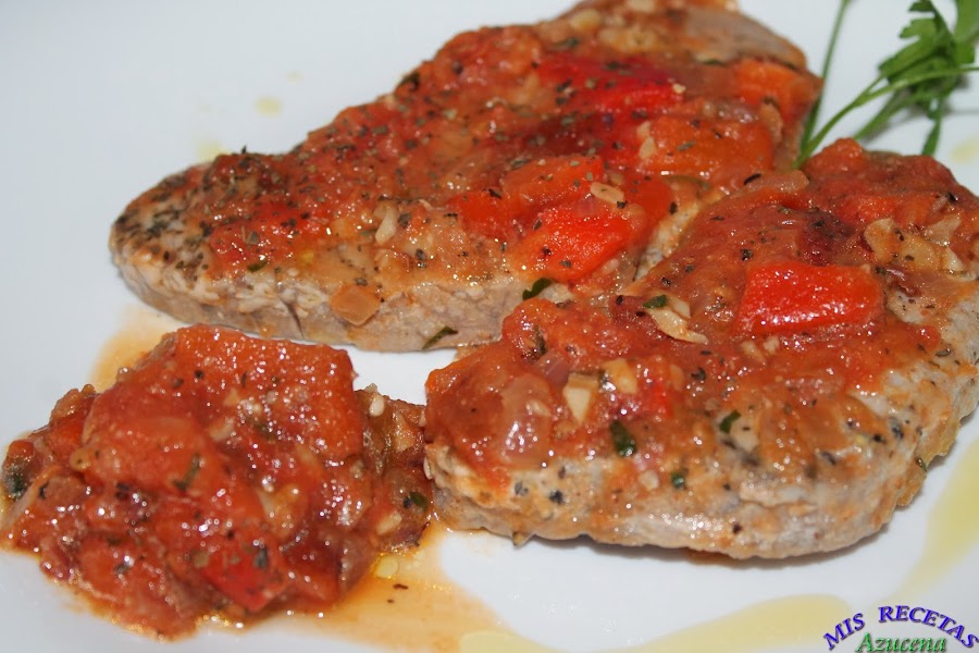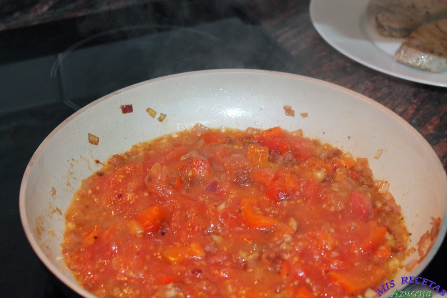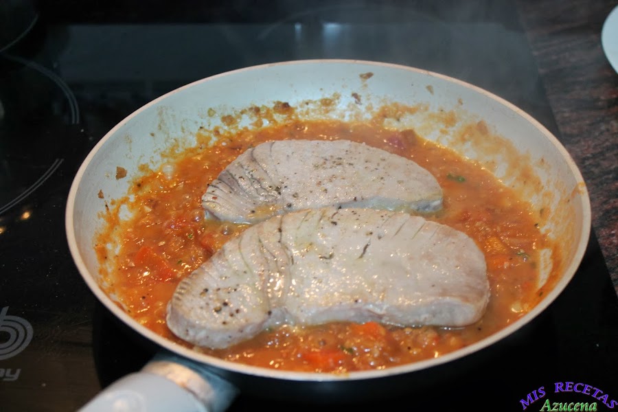 En ese momento añadiremos los filetes de atún, tapamos la sarta y los dejamos 30 segundos para poder darle la vuelta, una vez le demos la vuelta a los filetes, le pondremos una pizca de albahaca por encima y volvemos a tapar la sartén, retiramos del fuego, con el calor del sofrito terminara de hacerse el atún y no se quedará seco.