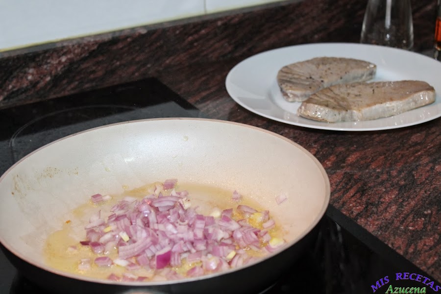 En la misma sartén que acabamos de hacer los filetes de atún volveremos a añadir un poco más de aceite para sofreír la cebolla que la tendremos ya picada en cuadraditos pequeños.