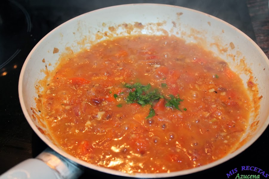 Mientras se sofríe el tomate picaremos el perejil y lo añadiremos a la sartén, volvemos a remover todo, comprobamos el punto de sal y dejamos sofreír hasta que se pierda casi todo el caldo.