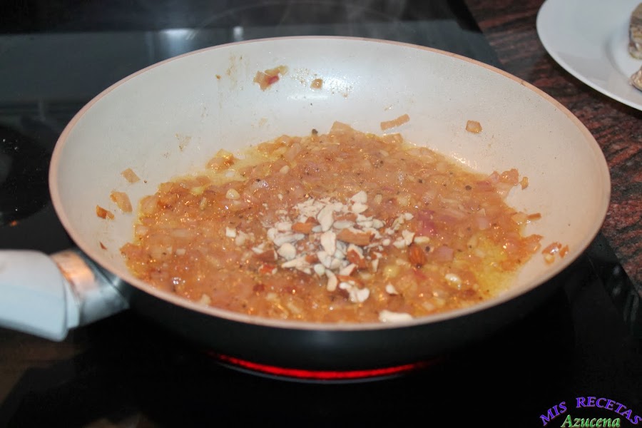 Una vez haya reducido el líquido de la sartén a la mitad añadiremos las almendras, removemos bien y dejamos sofreír.