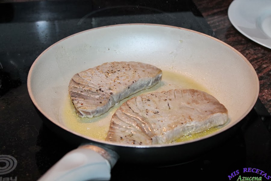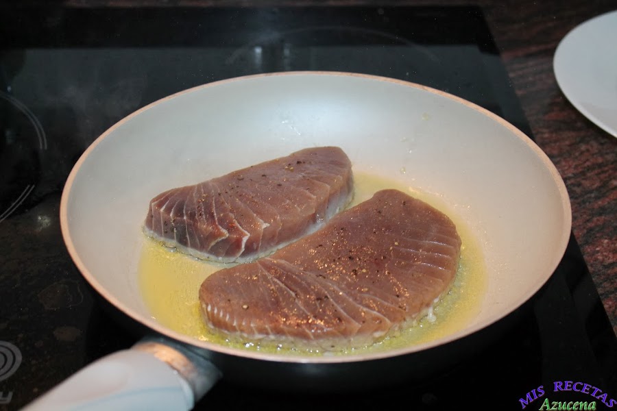 Lo primero que haremos será el sellar el atún, para ello ponemos una sartén al fuego a fuego medio alto, cuando este caliente añadiremos un chorreón de aceite, ahora salpimentamos los filetes de atún y los ponemos al fuego, los dejaremos unos 20 segundos por cada lado, retiramos del fuego y reservamos en un plato.
