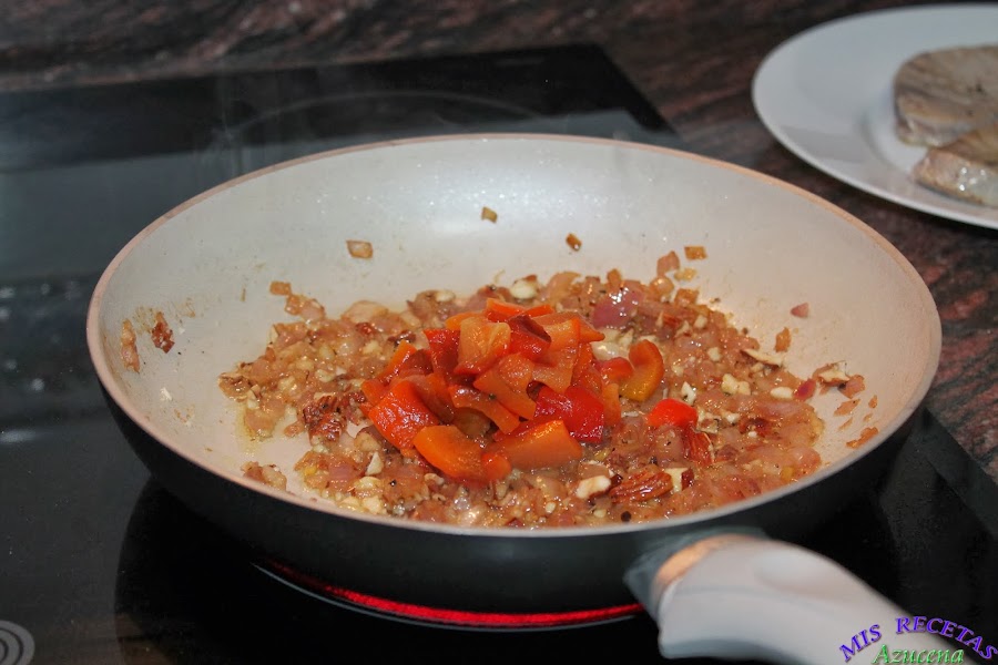 Mientras se sofríe todo pelaremos el pimiento y lo picaremos en cuadrados, si no tienes tiempo de asar el pimiento lo podemos comprar ya asado, cuando el sofrito de la sartén este casi reducido añadiremos los pimientos, removemos y dejamos sofreír durante 2 minutos más.