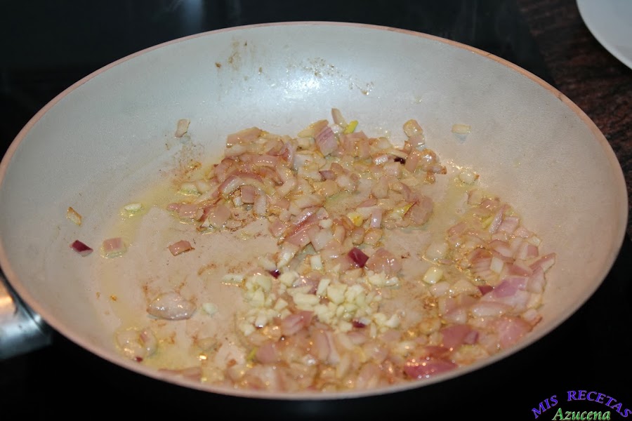Mientras se pocha la cebolla pelaremos el ajo, lo picaremos en trozos pequeños y los añadimos a la sartén.