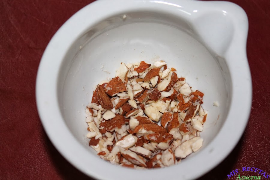 Ahora cogemos el mortero y machacaremos las almendras, las dejaremos en trozos no muy pequeños, si queda alguna por la mitad no pasa nada.