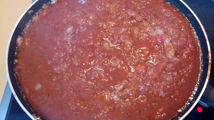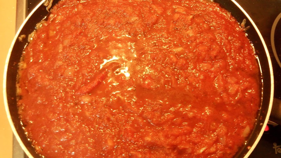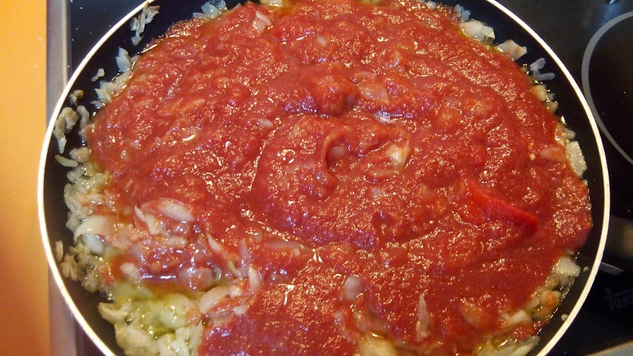 Cuando la cebolla y el pimiento estén hechos agregamos el tomate triturado. Lo dejamos unos 10 minutos.