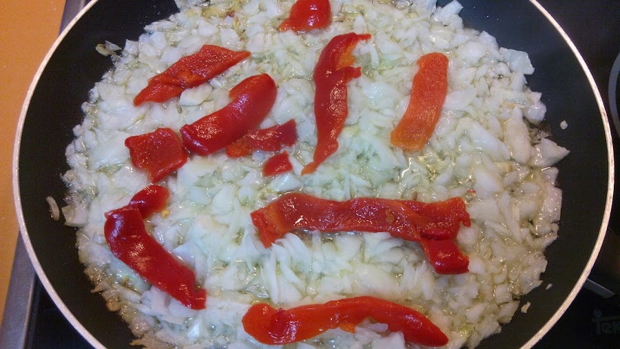 Cuando veamos que empieza a ponerse transparente añadimos el pimiento rojo cortado a tiritas.