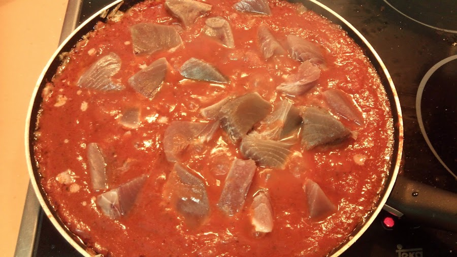 Y ya por último incoporamos el atún. Yo lo he partido a trozos.