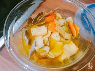 – Machacar los ajos pelados y freir, incorporar el laurel, tomillo y la piel y zumo de los cítricos
